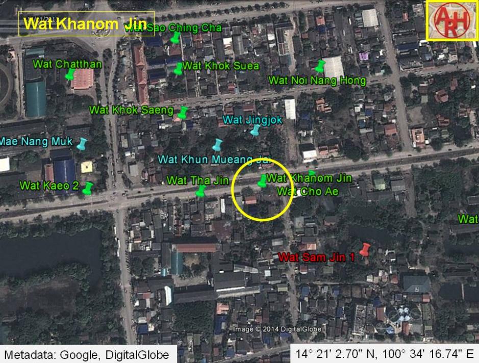 | Addendum Wat Khanom Jin is mentioned - as written above - on Phraya Boran Rachathanin's map drafted in 1926. On a 1974 Fine Arts Department map, the temple (in an identical position) is named Wat Sam Jin or the Monastery of the Three Chinese. The ruin called Wat Sam Jin today is mentioned on the 1974 map as Wat Thanon Jin or the Monastery of the Chinese Street. On all later FAD maps Wat Khanom Jin is not mentioned anymore. The temple was probably situated on what is today the wide avenue called Rojana Rd, leading to the Naresuan and Pridi Phanom Yong Bridges. Wat Khanom Jin was located approximately in Geo Coord: 14° 20' 54.56" N, 100° 35' 29.51" E. |