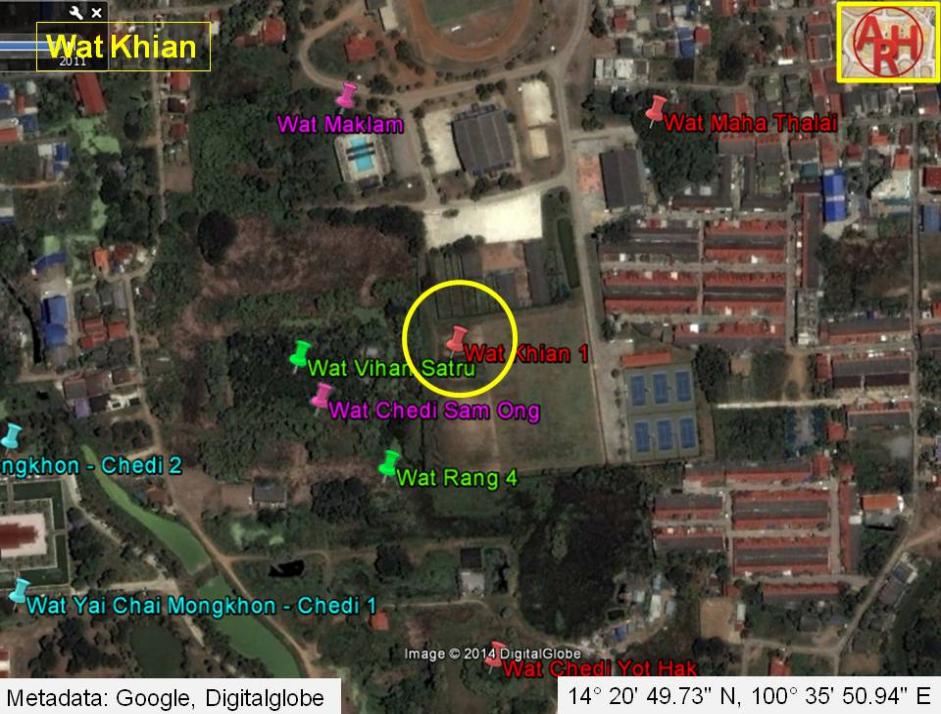 | Wat Khian is located off the city island in a sports complex east of Wat Yai Chai Mongkhon. This deserted monastery is situated next to a football pitch. It is covered in heavy vegetation and easy to overlook. The main architectural feature is a partially restored sermon hall that is oriented toward the east. This has eroded down to the basic foundation and there are no traces of walls left. A small alter is visible with the debris of some Buddha images. The remains of a bell-shaped chedi and its toppled spire can still be seen. This style suggests the middle Ayutthaya period. There is no historic record for this monastery; however, there is evidence that earth walls once passed through this southeastern area but were knocked over to make room for rice fields. This could explain Wat Khian's remote location. In 1972, construction work was suspended on an extension of an agricultural school in this area after machinery dug up the remains of at least five temples. It is interesting to note that virtually all of the buildings in this sports complex were constructed above the ground without further digging. |