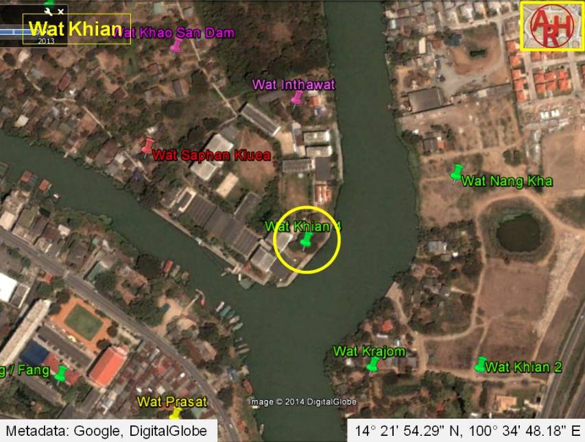 | Wat Khian or the Monastery of the Writing (1) was located off the city island in the northern area of Ayutthaya in Hua Ro sub-district. The monastery was situated on the south tip of Ko Loi, Ayutthaya's floating island. Wat Khian stood south of Wat Inthawat and east of Wat Saphan Kluea at the confluence of the former Klong Sai and Khlong Khu Na Mueang, at present the Pa Sak River. There are no traces anymore visible of the monastery above ground level. Historical data about the monastery and its construction are unknown. The site is only indicated on a 2007 Fine Arts Department map as วัดเขียน (๑). Some remains of the temple were excavated by the Fine Arts Department (FAD) in geographical coordinates: 14° 21' 54.29" N, 100° 34' 48.18" E. Footnotes: (1) Khian (เขียน), translated meaning "writing", was sometimes given in Siam as a nickname to a person. Monasteries were often named after their establishers or sponsors. The monastery here could have been eventually named after its sponsor. |