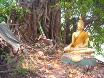 | Wat Khok Kaeo or the Monastery of the Crystal Mound is a ruin located off the main island in the Southeast sector. It is one of the southernmost monasteries on a 1993 map. The nearest landmark would be the Japanese village. Wat Khok Kaeo was remotely located along rice fields. It would have been accessible via Chao Phraya River or Khlong Rong Wari. In situ is large unidentifiable brick structure. An enormous Bodhi tree has grown entirely over it, appearing to swallow it like a giant squid. There is a basic foundation remaining and possibly a chedi. However, the Bodhi tree engulfs most of the ruin’s remains, leaving a clump of collapsed bricks. A modern Buddha image in the Taming Mara pose has been placed on site, which serves as part of a shrine for offerings. The history of Wat Khok Kaeo and its construction date is unknown. It is not clear what purpose it served in this remote location. Locals have told me that a ghost lives in this tree. I was warned not to disturb it. Nevertheless a countryside road passes directly beside the former monastery, and traffic may become a future issue. |