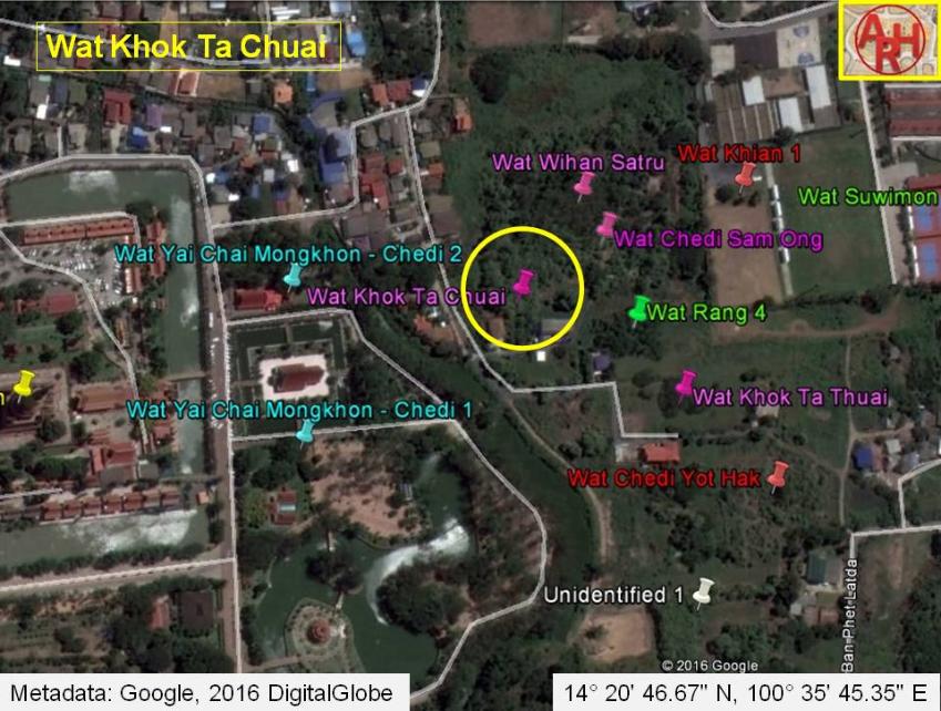 | Wat Khok Ta Chuai is situated off the city island in the eastern area of Ayutthaya in Phai Ling Sub-district. The site consists of a brick mound being a remnant of the former temple encroached by vegetation. The defunct monastery was situated north of Wat Chedi Yot Hak, south of Wat Wihan Satru, east of Wat Yai Chai Mongkhon - Chedi 2 and on the same horizontal axis as the latter. Its historical background and period of construction are unknown. The site was indicated by Khun Chin during a visit in the area in March 2016. The remnants of Wat Khok Ta Chuai are located in geographical coordinates: 14° 20' 46.67" N, 100° 35' 45.35" E. |