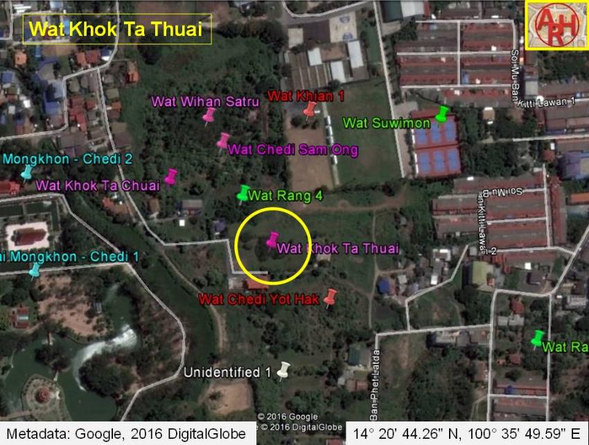 | Wat Khok Ta Thuai is situated off the city island in the eastern area of Ayutthaya in Phai Ling Sub-district. The site consists of a brick mound, being a remnant of the former temple encroached by vegetation. The defunct monastery was situated north of Wat Chedi Yot Hak, south of Wat Wihan Satru, east of Wat Yai Chai Mongkhon and on the same horizontal axis as the latter. Its historical background and period of construction are unknown. The site was indicated by Khun Chin during a visit in the area in March 2016. The remnants of Wat Khok Ta Thuai are located in geographical coordinates: 14° 20' 44.26" N, 100° 35' 49.59" E. |