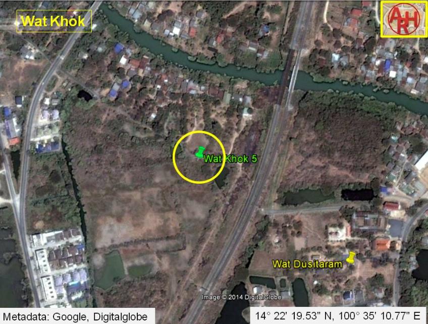 | Wat Khok or the Monastery of the Mound was located off the city island in the eastern area of Ayutthaya in Hantra Sub-district. The temple was situated south of Khlong Hantra on the east bank of a canal leading to the latter. Wat Pa Kho stood on its far north-west, while Wat Dusitaram was situated on its east. There are no traces anymore of the former monastery above ground level. Historical data about the monastery and its construction are unknown. The ste is indicated on a 1974 Fine Arts Department (FAD) map. Some remains of the temple were excavated by the FAD in Geo Coord: +14° 22' 19.53" N, +100° 35' 10.77" E. |