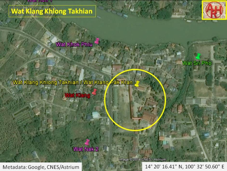 | Wat Klang Khlong Takhian or the Monastery in the Middle of Takhian Canal is an active temple located off the city island in the southern area of Ayutthaya in Pak Kran Sub-district. The monastery also know as Wat Klang Pak Kran, is situated at the confluence of the Chao Phraya River and Khlong Takhian (1), on the west bank of the latter. The St Joseph Church and the ancient Cochin Chinese Settlement lies just opposite the other bank of the canal. The old Wat Klang is situated to its west, opposite the road. Wat Nak lies just south of Wat Klang. Opposite the Chao Phraya River is Wat Wang Chai. In situ we find the classic monastic structures. The monastery is quite large, but dates from the post Ayutthaya period. The ordination hall was built in the Late Ayutthaya style (1629-1767 AD). The hall has two elevated porches with each two entries and the two-tiered roof is supported by four columns. The longest walls of ubosot have five windows each. The hall is surrounded by an inner wall or crystal wall (Th: Kamphaeng Kaeo) demarcating the sacred area. Historical data about the monastery and its construction are unknown. The site is not indicated on Phraya Boran Rachathanin's map drafted in 1926. This could be an indication that this monastery was constructed after 1926 as a substitute for the old Wat Klang. Near Wat Klang and Wat Nak was one of the five former ferry crossings across the Chao Phraya River, linking the monasteries with Tha Wang Chai (Wang Chai landing). (2) [1] Wat Klang Khlong Takhian is located in geographical coordinates: 14° 20' 16.1" N, 100° 32' 51.3" E (14.337808, 100.547577). Footnotes: (1) Also called Khu Lakhon Chai or "Le Canal du Grand Cochon" (Great Cochon River). A floating market (Khlong Khu Lakhon Chai market) was held at the mouth of this canal. [2] (2) In Ayutthayan times there were twenty-two ferry routes between the main land and the city island. The southern area had six crossings: Hua Sarapha to Wat Phanan Choeng, Tha Hoi to Wat Pa Jak, Tha Phra Rachawangsan to Wat Khun Phrom, Tha Dan Chi to Wat Surintharam, Tha Chakrai Noi to Wat Tha Rap and Tha Wang Chai to Wat Nak. [1] See "The Boat & Ferry Landings of Ayutthaya". References: [1] Athibai Phaenthi Phra Nakhon Sri Ayutthaya kap khamwinitjai khong Phraya Boran Racha Thanin - Explanation of the map of the Capital of Ayutthaya with a ruling of Phraya Boran Rachathanin - Revised 2nd edition and Geography of the Ayutthaya Kingdom - Ton Chabab print office - Nonthaburi (2007) - page 91. [2] Discovering Ayutthaya - Charnvit Kasetsiri & Michael Wright (2007) - page 272. |