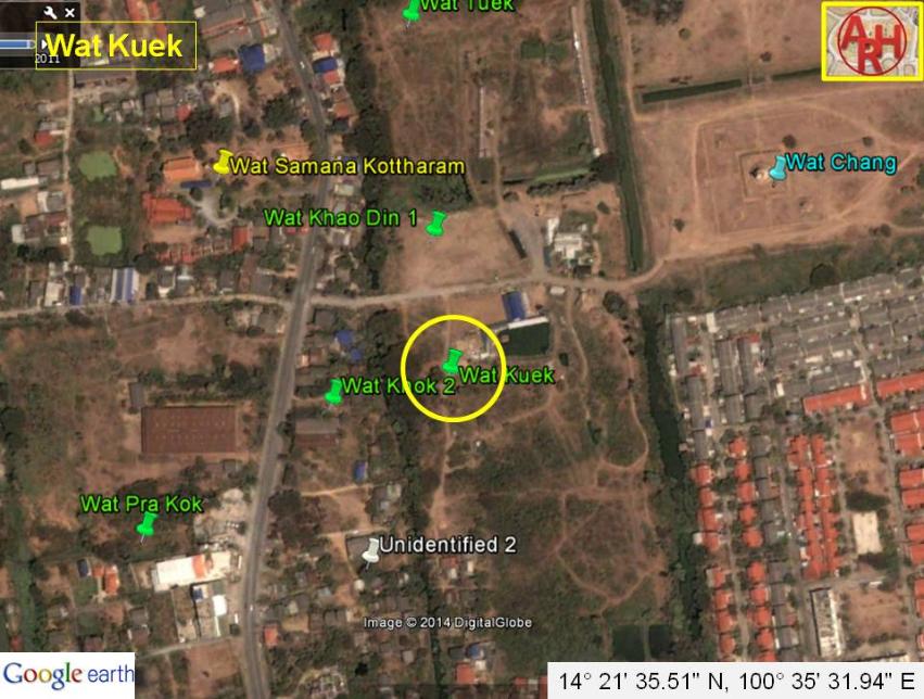 | Wat Kuek is a defunct monastery situated off the city island in the eastern area of Ayutthaya in Phai Ling sub-district. The monastery was situated south-east of Wat Samana Kot and below Wat Khao Din on the east bank of Khlong Kudi Dao. There are no visible traces remaining of this monastery at ground level. Its historical background and period of construction are unknown. Wat Kuek figures only on the Fine Arts Department maps of 1974 and 1993 and was located in the approximate Geo Coord: 14° 21' 35.51" N, 100° 35' 31.94" E. |