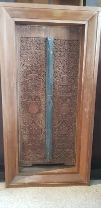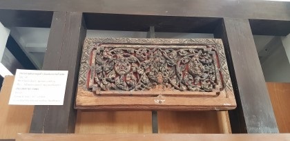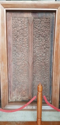 | (Wooden door and decorative panels in Bangkok style (Rattanakosin art) dating back to the 19th century, originating from Wat Mai Khlong Sra Bua. There are four doors (eight panels) kept at the Chao Sam Phraya National Museum. The panels are adorned with engravings of the Hibiscus Mutabilis, also known as the Confederate rose (Th: Phuttan) considered by the Chinese as an auspicious flower; engraved Chinese vases, symbolising peaceful desire, as well as fretwork (interlaced decorative design carved in low relief on a solid background) depicting the endless or eternal knot, being one of the Eight Auspicious Symbols. The panels contain also engraved birds, squirrels and butterflies.) |