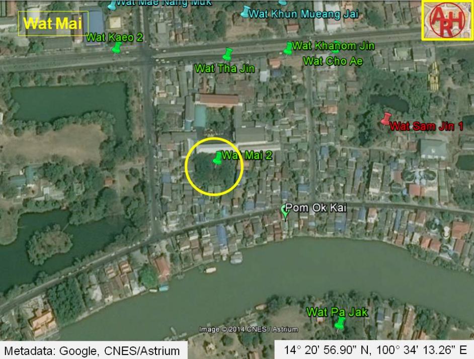 | Wat Mai is a defunct temple formerly located on Ayutthaya's city island in present Pratu Chai Sub-district, in the vicinity of an area formerly called Laem Sarapha. Following a map of the 19th century, the monastery was situated along the east bank of Khlong Pratu Jin and south of the road running over the Talat Jin Bridge. The temple stood west of Wat Sam Jin, a still existing ruin. Historical data about the monastery and its construction are unknown. The map indicates the existence of and northwest of the Ok Kai Fortress. The temple is mentioned on a 19th century map, but features on no other maps of Ayutthaya. Making an assessment of all the monastic structures, in the zone demarcated by Chikun Road, Pa Thon Road, Pridi Banomyong Road and U-Thong Road is rather difficult, as the position and name of the structures vary on different maps. On a 19th century map, there are 15 structures counted, while on the 20th century PBR map there are 13 mentioned. There is inconsistency in the names and the positions. Even maps drafted by the Fine Arts Department, what I presume, based on excavations in the zone, shed no light on this matter. Positions of monastic structures can be asserted, but their ancient names will remain questioned forever. Wat Mai should have been located in the vicinity of geographical coordinates: 14° 20' 56.90" N, 100° 34' 13.26" E. |