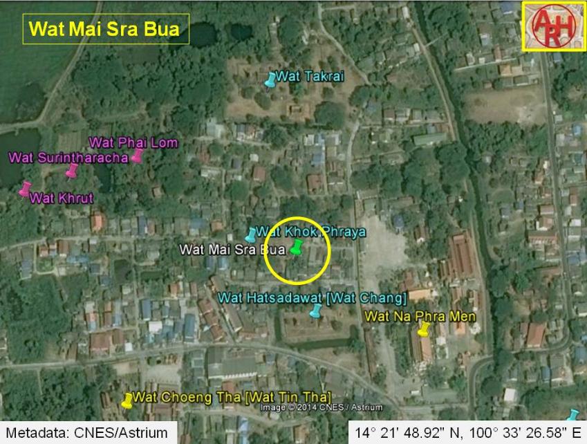 | Wat Mai Sra Bua was located off the city island in the northern area of Ayutthaya in Khlong Sra Bua sub-district. The monastery was situated adjacent (east) of Wat Khok Phraya and north of Wat Hatsadawat. There are no traces anymore visible of the monastery above ground level. Historical data about the monastery and its construction are unknown. The site is only indicated on a 2007 Fine Arts Department map as วัดใหม่สระบัว. Some remains of the temple were excavated by the Fine Arts Department (FAD) in Geo Coord: +14° 21' 48.92" N, +100° 33' 26.58" E. |