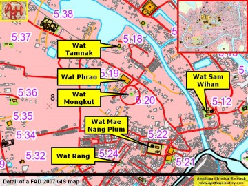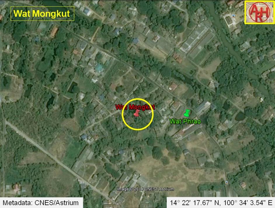 | Addendum Wat Mongkut or the Monastery of the Crown was located off the city island in the northern area of Ayutthaya in Khlong Sra Bua sub-district. The monastery stood in an area called before Thung Kaeo or "crystal field", bordered on the west and north by Khlong Sra Bua; on the east by Khlong Hua Ro and in the south by Khlong Mueang. Wat Phrao stood east of Wat Mongkut and south of Wat Tamnak. The monastery is indicated on 1993 and 2007 Fine Arts Department (FAD) maps. The ruins of temple are situated in Geo Coord: 14° 22' 17.67" N, 100° 34' 3.54" E. |