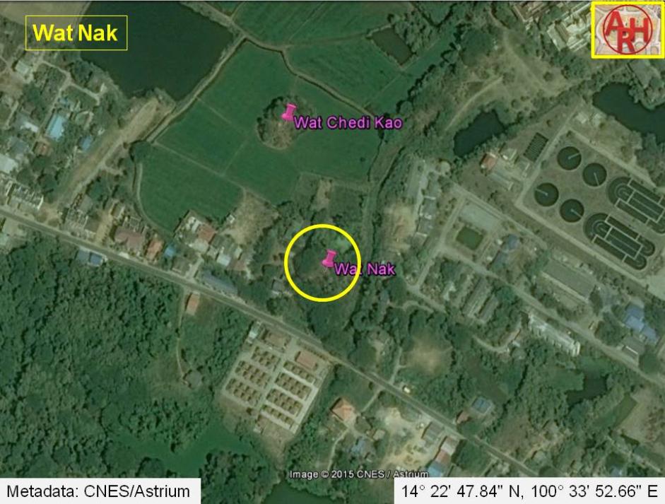 | Addendum Wat Nak or the Monastery of the Naga is located off the city island in the northern area of Ayutthaya in Suan Phrik sub-district. It can be reached by the road No 3060 leading from the Elephant Kraal to Wat Phukhao Thong. This area was called in earlier times “Thale Ya” or “Sea of Grass” as the whole area was as a large grass field. “Thale Ya” was derived from the name of the sub-district at that time, being “Thamle Ya”. The temple was situated on the north bank of canal leading from the old Lopburi River to Wat Borommawong, called Khlong Nam Ya. In situ there is still a brick mound and an ancient pond. In recent times a commemorating vihara has been put on top. In the vihara is a pedestal with three Buddha images found at location. The story goes that one day “heaven called” and local people found on the spot, a head of a Buddha image sticking out of the ground, the flame filial (ketumala) broken. The locals dug out the image, repaired the filial, built a vihara on top of the ruins of Wat Nak and gave the statue a prominent place within. The two flanking Buddha images inside the vihara were also found on site, their bodies decapitated. These images were also repaired. Historical data about the monastery and its construction is unknown. The site is located in Geo Coord: +14° 22' 47.84" N, +100° 33' 52.66" E. |