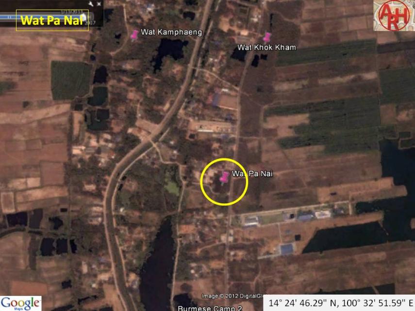 | Wat Pa Nai or the Monastery of the Inner Grove was located off the city island in the northern area of Ayutthaya in Pho Sam Ton sub-district of Bang Pahan in Ayutthaya Province. The temple was situated north of the former Burmese Pho Sam Ton Camp, on the east bank of the old Lopburi River, on a stretch called Khlong Ban Muang (Khlong Pho Sam Ton) today. In situ is just fallow land covered in dense vegetation. Locals in the vicinity said the area was leveled up. The historical background and period of construction of the former monastery are not known. Wat Pa Nai is situated in Geo Coord: 14° 24' 46.29" N, 100° 32' 51.59" E. |