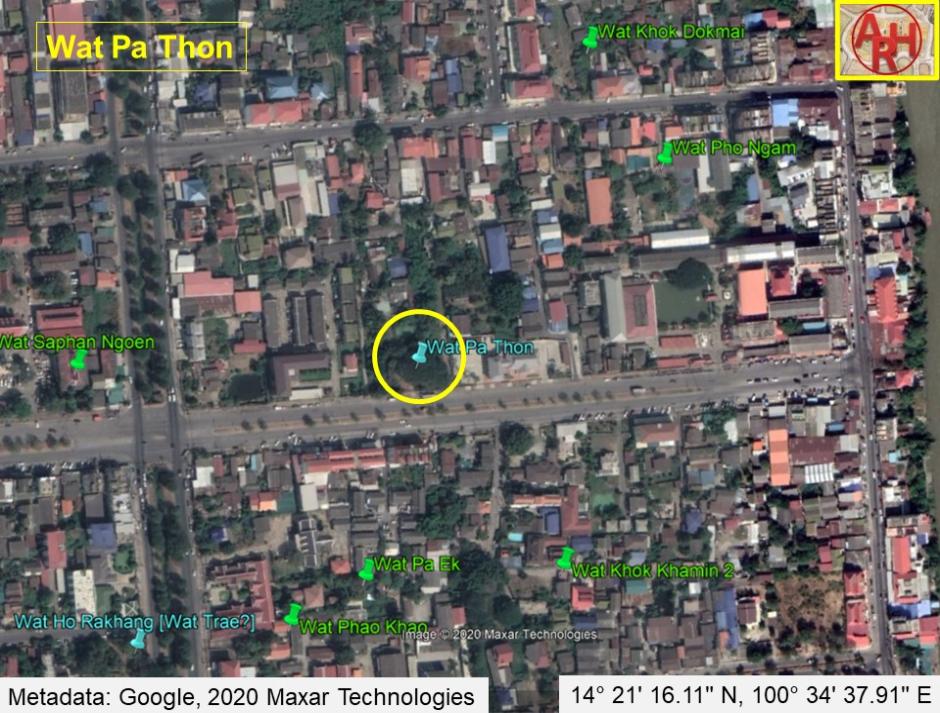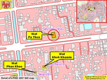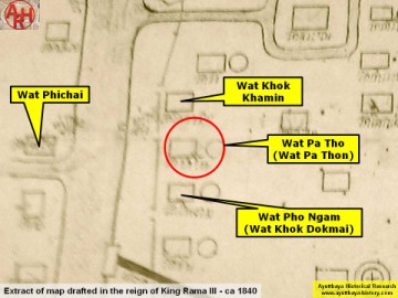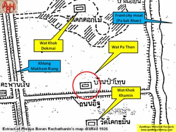 | Wat Pa Thon or the Monastery of the Thon Quarter was located on Ayutthaya's city island, outside the Historical Park in the east of the city, at present Ho Ratanachai Sub-district. Pa Thon was an area in Ayutthaya where the thon - a type of Thai drum - and other musical instruments were made. [1] The thon is a Thai goblet drum, a single headed drum. The head is around 20 cm in diameter. The drum has a ceramic or hard wooden body. The thon lies on the player's lap and is played with the right hand. The drum gives a low pitch. It is often played simultaneously with another instrument called ramana. The latter is held in the left hand and gives a high pitch. Together they are known as thon-ramana and played as a pair in Central Thai classical music, usually in the Khruang Sai Ensemble, a stringed ensemble. (1)[2] The monastery was situated between Khlong Nai Kai (present Khlong Makham Riang) and the Front City Canal (present Pa Sak River). To its north stood Wat Khok Dokmai, while in the south was Wat Khok Khamin. Wat Saphan Ngoen was situated in the west, opposite Khlong Nai Kai. Pratu Jao Jan, a gate in the city wall, was located to its east. There is still some brickwork visible of the monastic structure. The site has been restored after the flood of 2011. Historical data about the monastery and its construction are unknown. The site is indicated on a 19th century map under the name of Wat Pa Tho and on Phraya Boran Rachathanin's (PBR) map drafted in 1926 as Ban Pa Thon and as thus not referring to a temple. Following PBR the structure stood along a brick road, an extension of the Pa Thon Rd. A few meters south of this brick road, there must once have been a canal, which was part of a larger waterway connecting the Rear Palace with the Front City Canal. The remaining brick mound of Wat Pa Thon is located in geographical coordinates: 14° 21' 16.11" N, 100° 34' 37.91" E. Footnotes: (1) De La Loubère wrote the following about this instrument is his "A New Historical relation of the Kingdom of Siam": "The people do also accompany the voice in the evening into the courts of the houses, with akind of drum called Tong. They hold it with the left hand, and strike it continually with the right hand. 'T is an earthen bottle without a bottom, and which instead thereof is covered with a skin tyed to the neck with ropes." References: [1] Internet source http://www.ayutthayastudy.org retrieved on 16 July 2010 - Patone Road Or Dejavudh Road? by Patt Taengpun. [2] Internet source www.culture.go.th/research/musical retrieved on 16 July 2010. [3] Internet source www.thaimusic.net retrieved on 16 July 2010. |