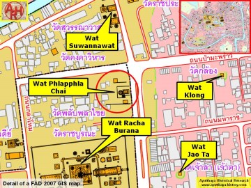 | This restored ruin is located on the corner of Chikun Road and Pa Maphrao Road. It is roughly situated between Wat Racha Burana and Wat Suwannawat. The area is referred to as the Pratu Chai district. There are three primary structures remaining at Wat Phlabphla Chai. At its entrance was a sermon hall. Three walls have survived, and some fragments of Buddha images can be seen on its altar. The sermon hall’s basic foundation has been reconstructed by the Fine Arts Department. Behind the sermon hall is a large bell-shaped chedi. Its spire and harmika have been rebuilt, but a large hole has been dug into the relic chamber by looters. A third chedi is located beside this one. The third chedi was constructed in the style of the Late Ayutthaya period. It is pyramidal and has multiple layers with indented corners. This rises in a prang-like structure, but its upper portion is gone. There is evidence that it once has niches at the relic chamber. In addition, the boundary walls of this restored ruin are clear at the ground level. There is also a small sub-structure south of the sermon hall that has small room-like cells made from brick and mortar. This could have been used as monk quarters. Another sub-structure exists on the northern side of the monastery, but the only thing remaining is a reconstructed floor. This monastery was built in an east/west axis facing Khlong Pratu Khao Pluak (now buried underground). It would have been situated within the old city walls. Foreign maps show the area directly west of it as a location for elephant stables (Vingboons 1665, Coronelli 1696, de La Loubere 1691). There is not much known about this monastery’s history or date of establishment. A hand-painted sign in situ suggests it was used as a military base in 1424 by Prince Ai Phraya before fighting a duel with his brother on elephant back. According to Royal Chronicles, after King Intharacha died in 1424, two sons fought for the throne in an area at the foot of Than Forest Bridge. Prince Ai Phraya set himself up at the Municipality of Maphrao (coconut) Forest at the Chai Pavilion, while his brother Prince Yi Phraya set himself up at the Chaiyaphum Monastery so as to enter the city by way of Chao Phrom Market (Cushman 15). Both brothers had their throats torn open at the same time by war scythes and neither of them survived. A third brother inherited the throne instead. It is believed by some scholars that Wat Phlabphla Chai is the Chai Pavillion mentioned in the Royal Chronicles, and coconut groves can still be seen near the monastery even today. This information suggests that the monastery was established in the Early Ayutthaya period. However, none of its structures resemble the architectural style of the Early Ayutthaya Period. The closest Khmer-style prangs from this period are found at Wat Chaiyaphum and at Wat Langka. Based on architecture style, it is reasonable to argue that Prince Ai Phraya might have actually set up in the vicinity of Wat Langka instead. |