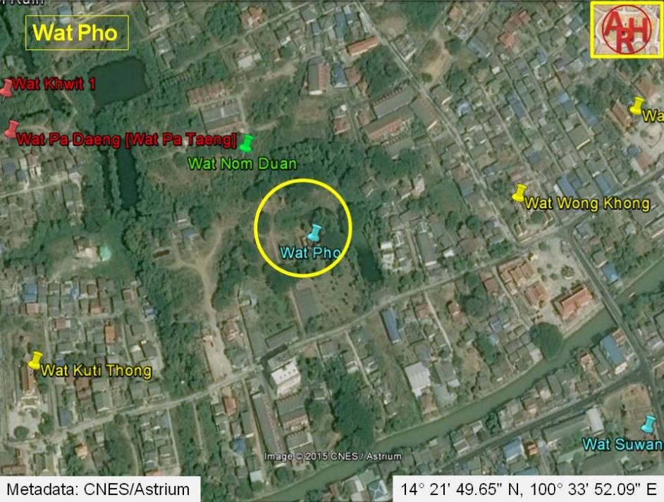 | Wat Pho or the Monastery of the Bodhi Tree is located off the city island in the northern area of Ayutthaya in Khlong Sra Bua Sub-district. This area, east of Khlong Sra Bua, was called before Thung Kaeo. The ruins of Wat Pho are situated in between Wat Kuti Thong and Wat Wong Khong. To find the relatively well-preserved ruins you need to go off road on a small path leading to the site. Access to the monastery was via a canal called Khlong Wat Pho; which can be noticed on Phraya Boran Rachathanin's map drafted in 1926. A ferry service - one of the former seven northern ferries across the old Lopburi River - was going up and down from the Ten Cowries Landing on the northeast corner of Wat Thammikarat on the city's side across to Khlong Wat Po. (1) [1] In earlier times this monastery seems to have been surrounded by a moat, as still traces of it can be seen. On a Fine Arts Department map dating from 1974 it is suggested that Khlong Wat Pho had a connection with Khlong Ban Pla Mo. Khlong Wat Po has been filled in the last century, probably when the road linking Wat Mai Khlong Sra Bua to Wat Wong Khong was constructed. In situ are the restored ruins of an ordination hall, a vihara and four foundations of satellite chedis, all surrounded by a "Kamphaeng Kaeo" or crystal wall. These structures had their main entrance on the south side as the Buddha images must have faced the Lopburi River. All structures are built in an east-west alignment. To the west of the monastic sanctuary stands a royal residence (tamnak) mostly used by high-ranking people when visiting a temple. The building has windows in Arabic style, divulging Iranian influence. The area is partly surrounded by a moat. In the north of the site stands a chedi with a double redented dome, indicative of the architecture from the Late Ayutthaya period (1629-1769 AD). Bricks still can be found over a large area, so the monastery could have contained much more structures. Following the Fine Arts Department, the site was 8 Rai, 1 Ngan and 56 Talang Wa, which is approximately 70 acres. Historical data about the monastery and its construction is unknown. The site is difficult to access in the rainy season due to flooding. Footnotes: (1) In the Ayutthayan era there were twenty-two ferry routes. In the northern area, the six other crossings were: Tha Nuea to Wat Khun Yuan, Tha Ma Ap Nam to Wat Choeng Tha, Tha Khan to Sala Trawen, Wat Tha Sai to Wat Rong Khong, Wat Song to Wat Pa Khonthi and Tha Khun Nang to Wat Mae Nang Plum. [1] See "The Boat & Ferry Landings of Ayutthaya". References: [1] Athibai Phaenthi Phra Nakhon Sri Ayutthaya kap khamwinitjai khong Phraya Boran Racha Thanin - Explanation of the map of the Capital of Ayutthaya with a ruling of Phraya Boran Rachathanin - Revised 2nd edition and Geography of the Ayutthaya Kingdom - Ton Chabab print office - Nonthaburi (2007) - page 92. |