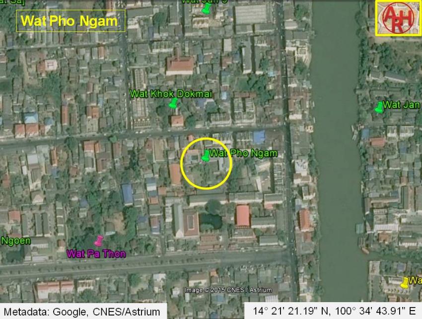 | Wat Pho Ngam or the Monastery of the Beautiful Bodhi Tree was located on the city island in the eastern part of Ayutthaya in Ho Ratanachai Sub-district in a locality called Bang Ian. The monastery was situated between Khlong Khu Na Mueang or Front City Canal (at present the Pa Sak River) and Khlong Nai Kai (Khlong Makham Riang), just north of Wat Jan and south of Wat Pa Thon. There are no traces anymore visible of the monastery above ground level. Historical data about the monastery and its construction are unknown. The site is only indicated on a mid-19th century map and does not feature anymore on later maps. Wat Pho Ngam should have been located in approximative geographical coordinates: 14° 21' 21.19" N, 100° 34' 43.91" E. |