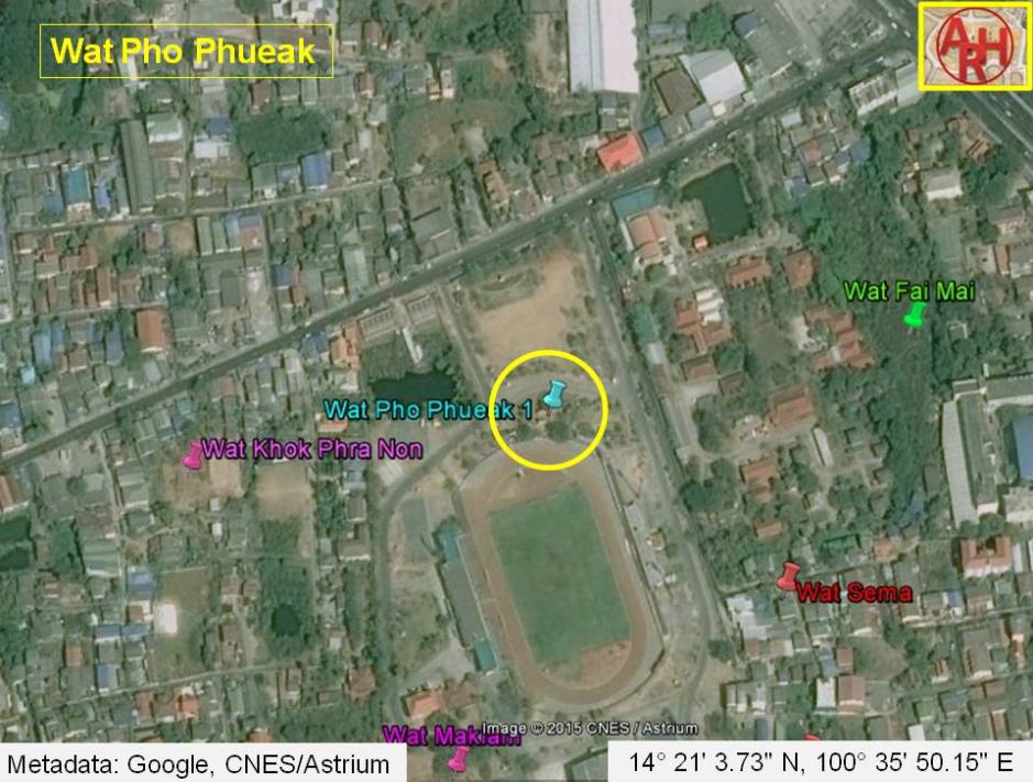 | Addendum Wat Pho Phueak or the Monastery of the White Bodhi Tree is at present only a ruin of single building, being prior a prayer hall. The vihara was aligned on an east-west axis and built with bricks and mortar. It had as usual a rectangular shape. The structure was 8.80 meters wide and 14.90 meters long. Wat Pho Phueak is situated on the West - East axis Wat Dusit - Wat Rerai - Wat Khok Phra Non - Wat Pho Phuaek - Wat Fai Mai. Based on an interview with Khun Chin near Wat Wihan Satru on 16 March 2016, Wat Pho Phueak is not the original name of this site. Wat Pho Phueak was in fact the site today called Wat Maklam. The ruins of Wat Pho Phueak are located in geographical coordinates: 14° 21' 3.53" N, 100° 35' 50.22" E. |
