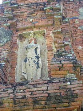 | Wat Phong is a deserted temple located on the city island within the Ayutthaya Historical Park. It can be easily visited on foot or by bicycle because a brick path passes beside it. Motor vehicles are not allowed to access it. This restored ruin was originally constructed toward an east/west axis. On the eastern side are the remains of a sermon hall. This has greatly eroded to the basic foundation level, but there are clear outlines of its walls, altar, and some stubs of pillars. The primary feature of this ruin is its unique chedi. There is no other like it in the city. On one hand, its niches and indented corner are suggestive of Late Ayutthaya period Chedi Si Suroyothai. However, these niches, which are located in each of the cardinal directions, are filled with standing Buddha images - a characteristic more commonly associated with Kingdoms to the north. Higher up the chedi, there are stucco figurines of mythological figures. One of these is remarkable similar to one at Wat Nok (a Mon site). The upper level almost takes the shape of a bell, but it is constricted and curved in a way untypical of the Middle Ayutthaya period. In addition, a small, Late Ayutthaya period chedi is also in situ. This takes the shape of a Khmer prang. Wat Phong seems to be designed as a fusion between various cultures of the time. The history of Wat Phong is unclear. Phraya Boran Rachatanin believed that it was associated with Mon residents who had a market near this site. It can be confirmed that Mon people lived in the vicinity. Royal Chronicles point out that a group of Mon settled at Wat Nok, which is only a stone’s throw away from Wat Phong. According to the Royal Chronicles, King Maha Thammaracha (r. 1569-1590) persuaded the family of a highly revered Mon monk - Tera Khan Chong - to live here around 1584. This honor was in reward for his role in Prince Naresuan’s war for independence from the Burmese. While still technically allied with the King Honsawadi of Burma, Prince Naresuan marched his troops to the city of Khraeng, where they encamped near the monastery of the Great Holy Tera Khan Chong. King Honsawadi, in the meantime, set up a plan to betray Prince Naresuan - sending out an army of 10,000 to ambush and kill him. Two Mon military leaders, Phraya Kiat and Phraya Ram, were ordered to attack Prince Naresuan’s troops and execute him (Cushman 88). However, the Great Holy Tera Khan Chong was informed of this treachery and supported Prince Naresuan. He arranged a meeting between Phraya Kiat, Phraya Ram, and Prince Naresuan in which all was revealed. As a result, Prince Naresuan declared revenge and announced that the two kingdoms "shall be totally divorced from each other from this day to the end of kalpa." (Cushman 89). He promised to escort the two Mon leaders and Holy Reverent to the safety of Ayutthaya - fighting against the Burmese along the way. The relatives of Tera Khan Chong were told to settle in a village behind Wat Nok (Cushman 90). This Mon areas stretched all the way from Wat Nok to Wat Phong. Wat Phong was situated along a road parallel to Khlong Nam Chiaw - a canal leading from Khlong Mueang (the old Lopburi River) to Bueng Phra Ram. The water flow of this canal was regulated by a gate known as Pratu Tasibiay. A portion of the gate’s wall can still be seen along U-Thong Road. This canal was aligned with a number of temples: Wat Chum Saeng, Wat Langkha Khao, Wat Langkha Dam, Wat Sangkha Pat, and Wat Yan Sen. A moat surrounded Wat Phong, creating a secluded islet. This swampy area (Kham Pheng Kleaw) was known for its tall grass. Wat Phong was restored in 1995. Earlier excavations at this monastery revealed brass containers, spoons, and forks. |