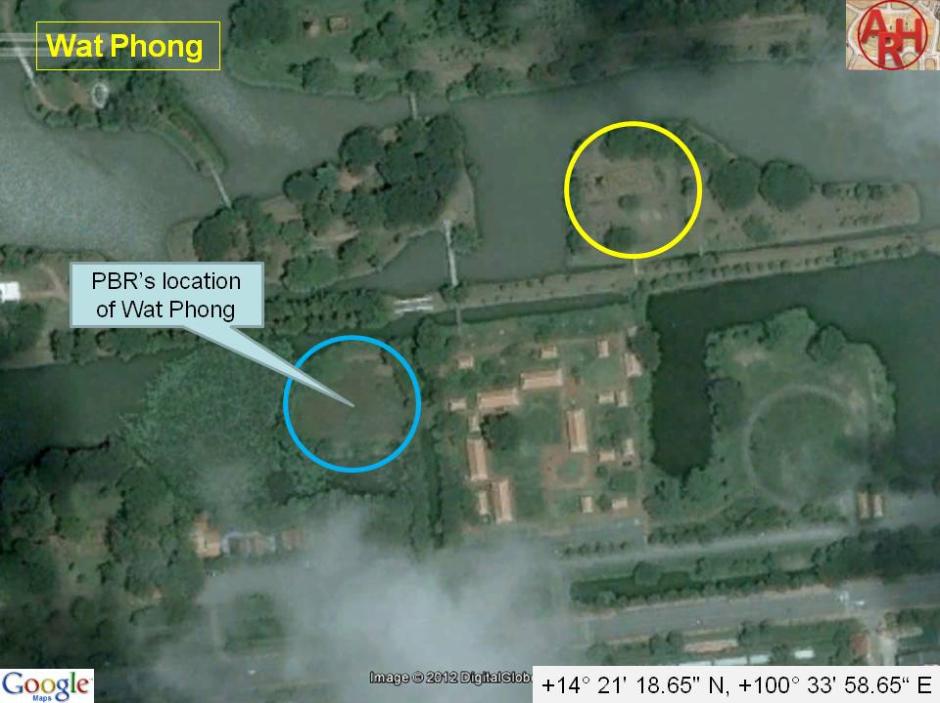 | In the text above the author speaks about Khlong Nam Chiao, which water flow was regulated by Pratu Tasibiay (commonly known as Pratu Tha Sip Bia or the "Gate of the Ten Cowries Landing"). Khlong Nam Chiao was in fact located more to the west, in between Wat Thammikarat and Wat Yan Sen. Wat Phong was situated along a road parallel to a canal called Lam Khu Pak Sra, feeding the marshy lake. Wat Phong is indicated on a map drafted in the mid-19th century and on Phraya Boran Rachathanin's (PBR) map of 1926. The mid-19th century map indicates the existence of a prang. Wat Phong is of course also found on Fine Arts Department maps drafted in 1957, 1974, 1993 and 2005. The "Master Plan for Tourism Development of Phra Nakhon Si Ayutthaya and the Neighbouring Provinces" mentions that there were no remains of this temple. The document stipulates that there were only three temples left in Bueng Phra Ram in 1988, all in poor condition, being: Wat Nok, Wat Song Pat (likely Wat Sangkha Pat) and Wat Langkha Dam. The ruin of Wat Phong we see today, must have been completely reconstructed. [1] I am not convinced that the ruin, the Fine Arts Department (FAD) indicates as Wat Phong, was the original location. The monastery is positioned on the south side of Fire Street on Phraya Boran Rachathanin's map. PBR only indicates on the north side a small islet without a temple. If we look into the earlier FAD maps of 1957, 1974 and 1993, we can see clearly that Wat Phong is situated south of Fire Street; in an identical position as on PBR's map; an area covered in vegetation today. The reconstructed site of Wat Phong on the north side of Fire Street, is likely historically not correct and could have been the site of Wat Talapat. In the Late Ayutthaya period there were shops of Thai and Mon selling bowls, trays, salvers and all kinds of brassware behind Wat Nok and in front of Wat Phong. In the area there was also a fresh market called the Mon Market. The restored ruin of Wat Phong is situated in geographical coordinates: 14° 21' 18.65" N, 100° 33' 58.65" E. References: [1] Master Plan for Tourism Development of Phra Nakhon Si Ayutthaya and the Neighbouring Provinces - Tourism Authority of Thailand - 6 August 1988 - page 4-58. [2] Markets and Production in the City of Ayutthaya before 1767: Translation and Analysis of Part of the Description of Ayutthaya - Chris Baker - Journal of the Siam Society, Vol. 99, 2011 - page 65. |