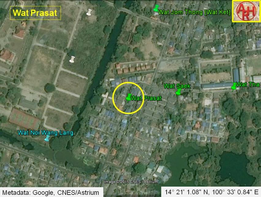 | Wat Prasat or the Monastery of the Castle was located on the city island in the western part of Ayutthaya in Pratu Chai Sub-district. The site is only indicated on a mid-19th century map and does not feature on Phraya Boran Rachathanin's (PBR) map drafted in 1926, which shows only an empty space in that area. The monastery was situated on the south bank of a canal longing the Talaeng Kaeng road, also called Thanon Lao. In the east stood Wat Saek, while on its south stood Wat Jom Thong. There are no traces anymore visible of the monastery above ground level. Author presumes this area was already cleared of temple ruins prior Phraya Boran Rachathanin's arrival in Ayutthaya. Historical data about the monastery and its construction are unknown. The mid-19th century map indicates the presence of a prang. Wat Prasat must have been located in approx. Geo. Coord.: 14° 21' 1.08" N, 100° 33' 0.84" E. |