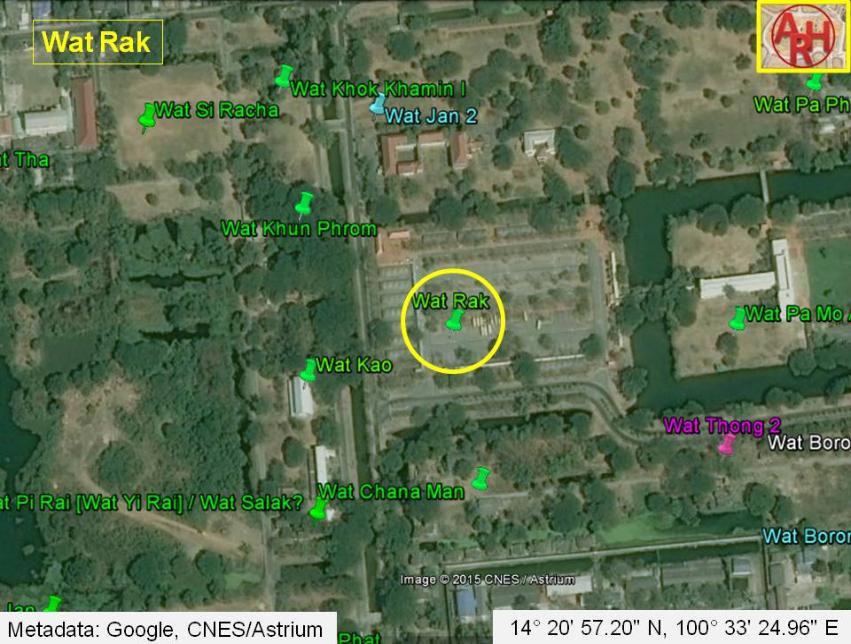 | Wat Rak or the Monastery of the Crown Flower was situated on Ayutthaya's city island in the Historical Park in Pratu Chai Sub-district. The temple was located on the east bank of Khlong Chakrai Yai, called Khlong Tho in its northern stretch. On its south stood Wat Chana Man (no traces anymore); opposite Khlong Chakrai were Wat Kao (no traces anymore) and Wat Khun Phrom. In the east stood Wat Pa Mo (no traces anymore), the name at par with Khlong Pa Mo, a canal running just south of the temple, being an extension of Khlong Tha Phra. There are no traces of foundations or brick work at ground level and the temple is classified as disappeared. The site is mentioned on Phraya Boran Rachathanin's map drafted in 1926 and on a mid-19th century map. The position of the temple matches both maps. Historical data about the monastery and its construction is unknown. The monastery was likely named after the Calotropis Gigantea or Crown flower, a species of Calotropis native to Cambodia, Indonesia, Malaysia, Philippines, Thailand, Sri Lanka, India and China. It is a large shrub growing to 4 m tall. Its flowers are strung into garlands to be worn around the necks of criminals on their way to the place of execution. In Thailand the Rak tree grows wild in deserted dry places. Its trunk and branches have a milky sap and its flowers are used for floral pieces which are to be seen usually at cremations. Today it is the fashion for a bride and groom to wear a garland of these flowers, for the name "rak" means "love" in Thai. [1] |