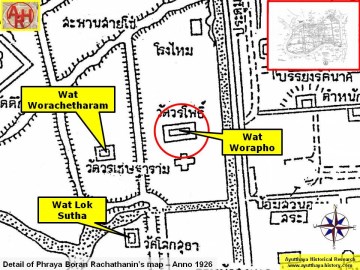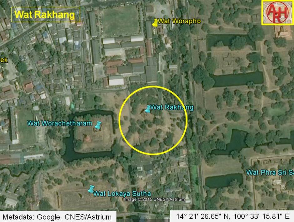 | Addendum The site is indicated on a mid-19th century map in an identical position as on Phraya Boran Rachathanin's map drafted in 1926. The mid-19th century map indicates the existence of a chedi. On the latter map the monastery is called Wat Borom Phot (วัดบรมโพธ), while on PBR's map it is called Wat Worapho (วัดวรโพธ์) During the reign of King Ekathotsarot (r. 1605-1610/11), Phra Intharacha (the eldest of three sons by a first class concubine) (1) was in the priesthood at Wat Rakhang holding the rank of Phra Rachakhana and bearing the title of Phra Phimontham Anantapricha. The latter would size/ascend the throne of King Si Saowaphak (r. 1610-1611?) and become known as King Song Tham. This period of history is very vague and there are different historical interpretations. Prince Damrong wrote it was thought that the Wat Rakhang mentioned here, to be the temple now called Wat Choeng Tha. [1] [2] Wat Rakhang or the Monastery of the Bell is located in Geo. Coord.: 14° 21' 26.65" N, 100° 33' 15.81" E. Footnotes: (1) Called Phra Sisin in the Royal Chronicles and known as Phra Phimontham. Phra Phimontham left the priesthood, revolted, gathered his adherents, seized the royal palace and put Somdet Phra Si Saowaphak to death. [1] References: [1] Our Wars with the Burmese - Prince Damrong Rajanubhab (1917) - White Lotus, Bangkok (2000) - page 203 & 367. [2] Discovering Ayutthaya - Charnvit Kasetsiri & Michael Wright (2007) - Toyota Thailand Foundation - page 195. |