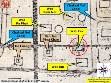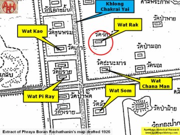 Wat Rak or the "Monastery of the Crown Flower" was situated on Ayutthaya's city island in the Historical Park in Pratu Chai sub-district. The temple was located on the east bank of Khlong Chakrai Yai, called Khlong Tho in its northern stretch.