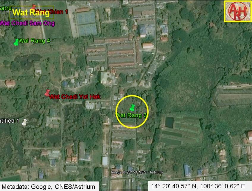 | Wat Rang (Lit: abandoned monastery) was located off the city island in the eastern area of Ayutthaya in Phai Ling Sub-district. The monastery was situated east of Wat Chedi Yot Hak, on the west bank of Khlong Pho. There are no traces anymore visible of the monastery above ground level. Historical data about the monastery and its construction are unknown. The site is only indicated on a 2007 Fine Arts Department map. Some remains of the temple were excavated by the Fine Arts Department (FAD) in Geo Coord: 14° 20' 40.57" N, 100° 36' 0.62" E. |