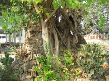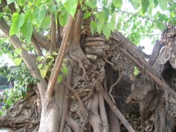 In situ remains only some brickwork, probably from the old ordination hall, enveloped in a tree and some broken parts of Buddha statues.