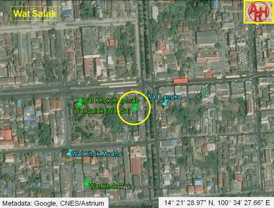 | Wat Salak or the Monastery of the Chisel was situated on Ayutthaya's city island in present Pratu Chai Sub-district, bordered by Khlong Makham Riang. The monastery stood opposite Wat Langka on the westbank of Khlong Makham Riang in former times called Khlong Nai Kai; a canal connecting Khlong Ho Ratana Chai in the north-east with the water ring in the south. The canal had its southern mouth at the Pratu Nai Kai, a water gate situated just west of Phet Fortress. Naresuan Road is situated just north of this defunct monastery. Historical data about the monastery and its construction are unknown. The site is indicated on Phraya Boran Rachathanin's map drafted in 1926. The monastery features also on a mid-19th century map but on the north side of the road leading from the Pa Than Bridge towards Pratu Joa Jin along the Front city canal. This road was called in earlier times Pa Than Rd, but was renamed Naresuan rd. The monastery features under the name Wat Sa on the map. Wat Salak was located in Geo. Coord.: 14° 21' 28.97" N, 100° 34' 27.66" E. |