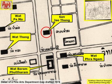 | Wat San Jao Thong or the Monastery of the Shrine of Jao Thong was located on Ayutthaya's city island outside the Historical Park in Pratu Chai Sub-district. There are no traces anymore visible of the monastery above ground level. Historical data about the monastery and its construction are unknown. A mid-19th century map shows Wat San Jao Thong south of an unidentified monastic structure and west of Wat Jingjok, north of a former brick road being an extension of Chinese Street. On the opposite side of the street stood Wat Kot (วัดกด). The monastery bears on this map the name Wat San Jao Thung (วัดสารเจ้าทุง). This location does not match with Phraya Boran Rachathanin's (PBR) map drafted in 1926, which indicates this temple on the west bank of Khlong Chakrai Noi. Wat Pa Nai was on its north; Wat Jingjok stood on its east on the opposite bank of the canal and Wat Phra Ngam was in the south. PBR indicated Wat San Jao Thong as a monastery, but there are indications this could have been a Chinese shrine. Wat Sala Jao Thong must have been approximately located in geographical coordinates: 14° 20' 55.92" N, 100° 33' 40.12" E. |
