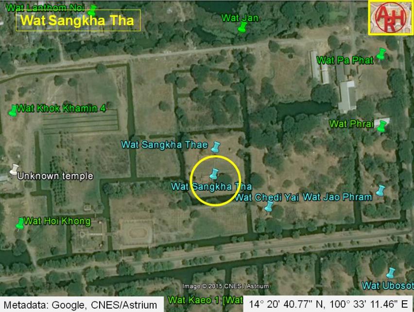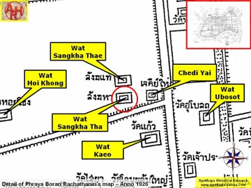 | Wat Sangkha Tha is located on the city island in the southwestern part of Ayutthaya in Pratu Chai sub-district. The temple is situated west of Khlong Chakrai Yai (an extension of Khlong Tho) in the Somdet Phra Sri Nakharin Park. In its immediate vicinity are Wat Sangkha Thae and Wat Chedi Yai, while Wat Jao Phram is located east of it. Being part of the Somdet Phra Sri Nakharin Park the ruin has been restored by the Fine Arts Department. The site which goes under the name of Wat Sangkha Tha, consists of two monastic structures being an ordination hall and a vihara, both with a chedi. Two other monastic structures are also in situ: a vihara called Wat Sangkha Thae or the "Monastery of the True Monkhood" and likely a bell or drum tower. The whole complex is surrounded by a moat. Only a path on its eastern side leads to the site. I presume that all buildings were part of one single monastery, although on the maps of Phraya Boran Rachathanin and the Fine Arts Department they are indicated as separated entities. The chedi of the vihara at the west has a three-tier redented chedi on an octagonal base. Its conical spire and harmika broke off and disappeared. Some stucco standing Buddha images are still partly visible. The ordination hall at the east has a Sinhalese-styled chedi on a square base. The bell-shaped dome with its harmika and umbrella semi-intact, rest on a three-leveled platform, the latter representing the "Traiphum" or the "Three Worlds". Its historical background and period of construction are unknown, but we can read in the Royal Chronicles of Ayutthaya that Reverend Yan Rakkhit of the Holy Royal Synod's Division of Meditation Matters was living here in 1755 at the Monastery of Sangkatha. He was invited by King Borommakot (r. 1733-1758) to come and study the methods of the way of holy transcendental meditation within the residence of the Reverend Professor of the Monastery of Binding and Overlaying in order to control the weather during the dedication of the Monastery of Phraya Kham. [1] The site is indicated on Phraya Boran Rachathanin's map drafted in 1926 in the same position as mentioned on the mid-19th century map. The restored ruin of Wat Sangkha Tha is located in geographical coordinates: 14° 20' 40.77" N, 100° 33' 11.46" E. References: [1] The Royal Chronicles of Ayutthaya - Richard D. Cushman (2006) - page 454 - Source: Royal Autograph. |