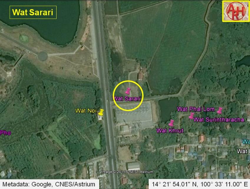| Wat Sarari was located off the city island in the northern area of Ayutthaya in Lum Phli Sub-district, on the edge of Thung Khwan. Wat Sarari was located just north of the electrical plant; east of the road # 309 leading to Ang Thong and the Naresuan Memorial Park. In situ is a brick mound covered with vegetation. An electrical mast was constructed on the site. The monastery was situated northwest of the three temples in line being Wat Khrut, Wat Surintharacha and Wat Phai Lom. Wihan Wat Noi stands on the west opposite the road. The monastery bears probably the name of its female founder. When a temple was built to earn merit, this was usually expressed in the name of the building. [1] The monastery is only indicated on a 1993 Fine Arts Department (FAD) maps. The ruins of temple are situated in Geo Coord: 14° 21' 54.01" N, 100° 33' 11.00" E. Historical data about the monastery and its construction are unknown. Footnotes: (1) ลุ่ม - low lying land / พลี - religious offering. References: [1] Buddhist Temples of Thailand - Karl Döhring (1920) - E.J. Tips (2000) - page 9. |