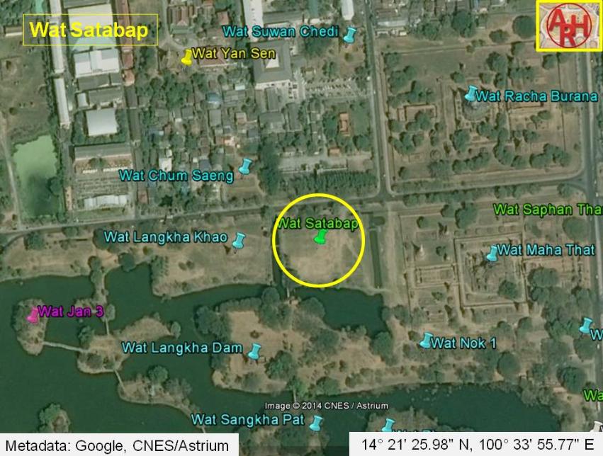 | Wat Satabap was located in the Historical Park on Ayutthaya's city island in Pratu Chai sub-district. The monastery was situated on the west side of Wat Maha That at par with Wat Nok on Maha That's southern side. The exact function of this temple, which stood on the west bank of a canal having its origin at the Kalahom Gate and its mouth at Bueng Phra Ram near Wat Nok, is not known. Historical data about the monastery and its construction are unknown. The site is indicated on Phraya Boran Rachathanin's map drafted in 1926 and on a Fine Arts Department map dating from 1993. |