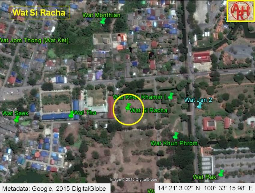 | Wat Si Racha or the Monastery of the Glorious King was located on the city island in the western area of Ayutthaya in Pratu Chai Sub-district. The site is only indicated on a mid-19th century map and does not feature on Phraya Boran Rachathanin's (PBR) map drafted in 1926, which shows only an empty space in that area. The monastery was situated on the south bank of a canal longing the Talaeng Kaeng road, also called Thanon Lao. In the west stood Wat Takhe, while on its south stood Wat Jan. There are no traces anymore visible of the monastery above ground level. Author presumes this area was already cleared of temple ruins prior Phraya Boran Rachathanin's arrival in Ayutthaya. Historical data about the monastery and its construction are unknown. Wat Si Racha must have been approximately located in geographical coordinates: 14° 21' 3.02" N, 100° 33' 15.98" E. |