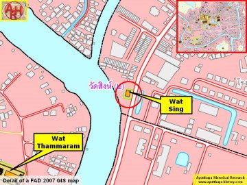 | Wat Sing or the Monastery of the Lion was located on the city island in the western area of Ayutthaya in Pratu Chai Sub-district. The temple was situated south of a former canal called Khlong Fang near its water gate, which made a junction with the Chao Phraya River (the former Lopburi River), and the Sat Kop Fortress. Wat Khok lied north of the temple, while Wat Sop Sawan and Wat Khok Chang stood on its south. There are no traces anymore of the former monastery. A Thai Army camp has been constructed on the site. The temple is classified as disappeared. Historical data about the monastery and its construction are unknown. The site is indicated on a mid-19th century map in an identical position as on Phraya Boran Rachathanin's map drafted in 1926. The mid-19th century map indicates the existence of a chedi, which at present has disappeared as the ancient monastic complex was leveled to become an army camp. In the Late Ayutthaya period there was a fresh market in front of the monastery called Lion's Head Market. [1] Wat Sing was located in geographical coordinates: 14° 21' 18.44" N, 100° 32' 54.89" E. References: [1] Markets and Production in the City of Ayutthaya before 1767: Translation and Analysis of Part of the Description of Ayutthaya - Chris Baker - Journal of the Siam Society, Vol. 99, 2011 - page 65. |