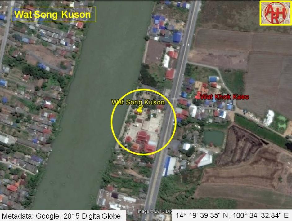 | Wat Song Kuson or the Monastery upholding Benevolence is an active monastery located off the city island in the south eastern area of Ayutthaya in Ko Rian Sub-district. The temple is located on the east bank of the Chao Phraya River, just south of the Japanese settlement and Wat Khok Yai Luk; and west of the ruins of Wat Khok Kaeo. It has the classic monastic structures in situ (ubosot, vihara, bell tower, etc). Wat Song Kuson is a post-Ayutthayan era temple. Wat Song Kuson is located in geographical coordinates: 14° 19' 39.35" N, 100° 34' 32.84" E. |