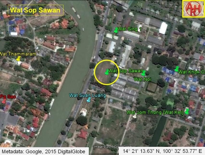 | Addendum Wat Sop Sawan is translated in Cushman's Royal Chronicles of Ayutthaya as the Monastery of the Corpses of Heaven. The monastery lied adjacent to the Monastery of the Crown Garden and is mentioned as one of the defense positions the Siamese occupied during the siege by the Burmese in 1760. When it was the fourteenth day of the waning moon in the fifth month, the Burmese brought up great guns, positioned them at the Monastery of the Royal Gift and at the Monastery of the Ruler, and fired them [CD: on] into the Capital. His Majesty the Holy Lord Omnipotent rode the premier bull elephant Defeater of a Hundred Thousand Troops to look with His [own] holy eyes at, and to give specific instructions to, the positions at the Monastery of the Crown Garden [D: , the Monastery] of the Corpses of Heaven and the Fort of Grand Victory. [1] Ex-King Uthumpon (r. 1758) left the monkhood to assist in the defense of the city. The Chronicles recall him doing an inspection of this position and others (on the 14th day of the waning moon in the 5th month) and the giving of specific instructions, after the Burmese fired their canons on the city, damaging buildings and wounding and killing people. King Suriyamarin (r. 1758-1767) ordered to answer the Burmese fire with the large guns in this position and others, on the opposite banks of the river. That evening the Burmese withdrew to the banks at the side of Wat Phukhao Thong. [1] The site is indicated on a mid-19th century map in an identical position as on Phraya Boran Rachathanin's map drafted in 1926. The mid-19th century map indicates the existence of a chedi, which at present has disappeared as the ancient monastic complex was leveled to become an army camp. Wat Sop Sawan was located just north of a boat landing called Tha Ruea Ban Jao Phraya Phonlathep in connection with Wat Thamma. Wat Sop Sawan was located in geographical coordinates: 14° 21' 13.63" N, 100° 32' 53.77" E. References: [1] The Royal Chronicles of Ayutthaya - Richard D. Cushman (2006) - page 482-3 / Source: Phan Canthanumat, British Museum & Reverend Phonnarat - The Burmese Besiege the Capital. |