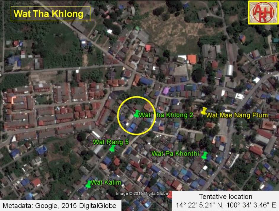 | Wat Tha Khlong or Monastery of the Landing of the Herd of Elephants was located off the city island in the northern area of Ayutthaya in Hua Ro Sub-district. The monastery features on Phraya Boran Rachathanin's 1926 map, and on a 1957 and 1974 Fine Arts Department map. On the latter map the monastery is denominated Wat Tha Phlong (วัดท่าโพลง). The monastery was situated above the north bank of the old Lopburi River, presently called Khlong Mueang or city canal, and west of Wat Mae Nang Plum, located near the village Ban Hua Ro. Following above mentioned maps, Wat Tha Khlong was pinched in between Wat Wihan Thong and Wat Mae Nang Plum. In the 16th century, prior the extension of Ayutthaya's city wall, elephants were kept in an area between Wat Song and Wat Khun Saen. Whether or not Tha Khlong had a relation with this, is unknown. Historical data about the monastery and its construction are unknown. In the manuscript Testimony of the king from Wat Pradu Songtham, a document likely compiled in the Early Ratanakosin period, is written that there was a land market in Iron Village at Tha Khlong (Herd Landing). At the village braziers for forging iron nails and cramps, large and small, were sold. [1][2][3] Some remains of a temple were excavated by the Fine Arts Department (FAD) in geographical coordinates: 14° 22' 2.34" N, 100° 34' 1.15" E and called Wat Rang 8. I presume the site could be the former location of Wat Tha Khlong. References: [1] Geographical description of Ayutthaya: Documents from the palace - Dr Winai Pongsripian - Bangkok (2007). [2] Note on the Testimonies and the Description of Ayutthaya - Chris Baker - Journal of the Siam Society, Vol. 99, 2011 - page 77 (paragraph on KWPS). [3] Markets and Production in the City of Ayutthaya before 1767: Translation and Analysis of Part of the Description of Ayutthaya - Chris Baker - Journal of the Siam Society, Vol. 99, 2011- page 52-4. |