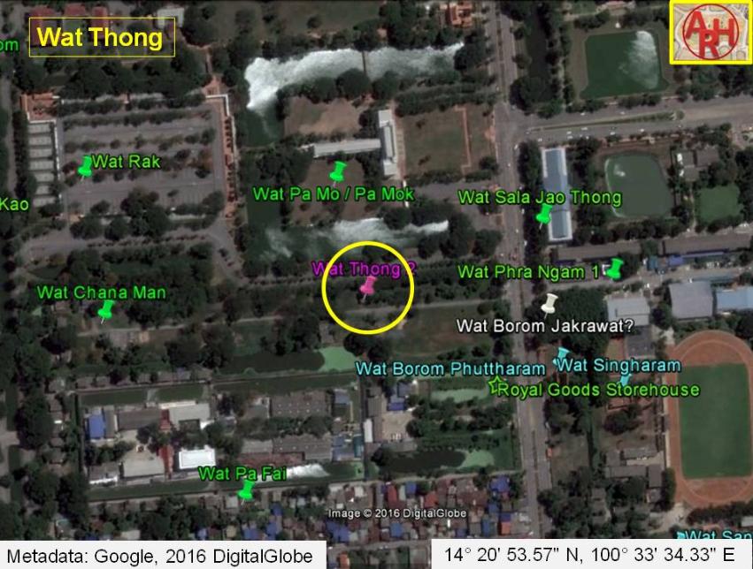 | Wat Thong or the Golden Monastery was situated on the city island in the Historical Park of Ayutthaya in Pratu Chai Sub-district. The temple was located on the north bank of Khlong Pa Mo, an extension of Khlong Klaep. On its north stood Wat Pa Mo (no traces anymore) and on its east Wat Chana Man (no traces anymore). The site lie south of the present Tourist Center within the Juvenile Detention area. In situ is only a small pavilion with a Buddha image of recent period. No other traces are visible at ground level. The site is mentioned on Phraya Boran Rachathanin's map drafted in 1926. The name of the monastery although is mentioned as Wat Nong or the "Flooded Monastery". When we look at a mid-19th century map it all becomes a bit more difficult. This old map mentions ten structures in the square delineated in the north by the old Talaeng Kaeng road, in the east by Khlong Chakrai Noi, in the south by the old ring road and in the west by Khlong Chakrai Yai. PBR's map mentions only seven structures. After comparing the maps, it is the author's opinion that Wat Thong Pa Mo Noi on the mid-19th century map, matches Phraya Boran Rachathanin's location of Wat Pa Mo the best. Wat Thong should be then the location of Wat Thong Pa Mo Yai on the mid-19th century map. The latter indicates the presence of a chedi at the time when the map was drafted. Historical data about the monastery and its construction is unknown. The site is located in geographical coordinates: 14° 20' 53.57" N, 100° 33' 34.33" E. |