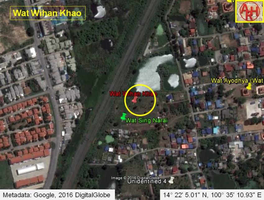 | Wat Wihan Khao or the Monastery of the White Sermon Hall is an not restored ruin, located just west of Wat Ayodhya, outside the city island in Hantra Sub-district. In situ are a brick mound covered with vegetation and the remainders of a bell-shaped chedi. Its style is associated with the Middle Ayutthaya period (1488 - 1629 AD), although there are no records of its original construction or its historical background. The chedi stands in line with the large chedi of Wat Ayodhya, which could be an indication that once this ruin could have been part of a larger monastery. The site has been victim of treasure farming in earlier times, as can be seen from the many holes dug into this chedi by looters. One hole is burrowed all the way through so that you can see the sky on the other side. Other holes have resulted in large cracks. Given that seasonal flooding is common in this area the temple's stability is in question. There are traces of an east-oriented un-excavated monastic structure, with shattered pieces of Buddha images. The site is situated in geographical coordinates: 14° 22' 5.01" N, 100° 35' 10.93" E. |