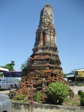 | Wat Wihan Thong or the Monastery of the Golden Vihara was located off the city island in the northern area at Hua Ro Sub-district. The temple was situated on the west bank of the old Lopburi River, presently called Khlong Mueang or City Canal. Wat Wihan Thong is situated north-east of Wat Intharam on private grounds. The temple stood opposite Wat Khian on the other bank of the river. Most of the monasteries along the old Lopburi were accessible by the water, but their premises have been split up last century due to the construction of a road from Wat Mai Khlong Sra Bua towards the Elephant Kraal. This is the case with Wat Kuti Thong, Wat Wong Khong and Wat Mae Nang Plum. In situ is a brick mound, with still some pillars, likely from the ordination hall, still standing. They can only be accessed through the small street adjacent to Wat Intharam and via a small path in between the stilt houses. The ruins are situated in the back garden of the latter. A chedi and an old Bodhi tree can be found on the premises of a private bus company. The chedi is twenty-rabbeted-angled, an architectural style from the second part of the Late Ayutthaya period (1629 - 1767 A.D.), sometimes called the Fourth period. This period starts with King Borommakot's ascendancy to the throne in 1733 A.D. and lasts until the Ayutthaya kingdom was devastated by the Burmese in 1767 A.D. King Borommakot (r. 1733-1758) was determined to renovate the old religious structures rather than building new ones and he restored many ancient monasteries and monuments. Historical data about the monastery and its construction are unknown. The site is indicated on a mid-19th century map and on Phraya Boran Rachathanin's map drafted in 1926. The ruins of Wat Wihan Thong are situated in geographical coordinates: 14° 21' 58.38" N, 100° 34' 6.22" E. |