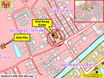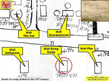 | Addendum The temple was before known as Wat Rong Khong. The renaming of "Rong" by "Wong" seems to come from the following: "rong" which means building, sounds also as coffin (Th: long). The word "rong" was not felt as a very auspicious name for a temple, hence the name change. The same occurred to Wat Pradu Songtham, being before two temple sites Wat Pradu and Wat Rongtham. Here also Rongtham was changed into Songtham. In the manuscript "Testimony of the king from Wat Pradu Songtham", a document likely compiled in the Early Ratanakosin Period, is written that there was a land market at Wat Rong Khong. [1][2][3] There was also a boat ferry between Wat Tha Sai (Sand Landing) to Wat Rong Khong. In the Ayutthayan era there were twenty-two ferry routes between the main land and the city island. The northern side had seven ferries. The six other crossings were: Tha Nuea to Wat Khun Yuan, Tha Khan to Sala Trawen, Tha Sip Bia to Wat Pho, Wat Song to Wat Pa Khonthi and Tha Khun Nang to Wat Mae Nang Plum. [1] See "The Boat & Ferry Landings of Ayutthaya". There was a village beside Wat Rong Khong along the road in front of Chaophraya Jakri’ s house. In the village women traders bought raw bananas to ripen and boil for sale. [1] [3] Wat Rong Khong is mentioned in the Royal Chronicles of Ayutthaya as the location were Cambodian troops were positioned in an attack on Ayutthaya in 1570. "Meanwhile, the King of Lawæk advanced with his army to the Capital and Royal Metropolis of Ayutthaya and encamped his army in the vicinity of Kathum Village. At that moment the King ordered Müang Nakhòn Phrom and the three thousand troops [CDEF: of the men] of Hongsawadi to man the positions on the front wall, and all the high-ranking officials of the provincial cities to examine and post soldiers to the positions on the walls and at intervals around the Royal Metropolis. The King of Lawæk advanced with his army and halted his elephant in Sam Phihan Monastery. And the enemy troops were posted at intervals to Rong Khòng Monastery and Kuti Thòng Monastery. Then they brought about thirty elephants and halted them in Na Phra Meru Rachikaram Monastery with about four thousand men. The King of Lawæk had soldiers board five boats and cross the river to attack Prince Sanuk’s corner of the wall. The King proceeded there and, halting his palanquin, sent his soldiers up to fight. The enemy being vanquished, the King then ordered a carong cannon fired on the enemy elephants which were standing in Sam Phihan Monastery. Phra Campathirat, who was the [commander of the] vanguard of the King of Lawæk, was hit and killed on the neck of his elephant. The King of Lawæk withdrew and returned to his army at Kathum Village. Three times they advanced to attack in that way but were unsuccessful. So the King of Lawæk, ending the campaign and returning, swept up the families in the vicinity of the villages in the paddy fields and in Nakhòn Nayok and took them to Lawæk. At that time the King of Lawæk repeatedly organized troops to scout about, both by land and by boat, and the inhabitants of Canthabun, the inhabitants of Rayòng, the inhabitants of Chachoengsao and farmers were speedily lost to the Lawæk enemy in great numbers." [5] Wat Wong Khong is situated in geographical coordinates: +14° 21' 51.23" N, +100° 33' 59.60" E. References: [1] Phanna phumisathan phranakhon si ayutthaya: ekkasan jak ho luang [Geographical description of Ayutthaya: Documents from the palace]. Edited by Winai Pongsripian. Bangkok: Usakane, n. d. [2007]. [2] Note on the Testimonies and the Description of Ayutthaya - Chris Baker - Journal of the Siam Society, Vol. 99, 2011 - page 77 (paragraph on KWPS). [3] Markets and Production in the City of Ayutthaya before 1767: Translation and Analysis of Part of the Description of Ayutthaya - Chris Baker - Journal of the Siam Society, Vol. 99, 2011- page 52/54. [4] Athibai phaen thi phra nakhon si ayutthaya - Explanation of the map of the Capital of Ayutthaya with a ruling of Phraya Boran Rachathanin - Revised 2nd edition and Geography of the Ayutthaya Kingdom - Ton Chabab print office - Nonthaburi (2007) - page 92. [5] The Royal Chronicles of Ayutthaya - Richard D. Cushman (2006) - page 77 / Source: British Museum, Reverend Phonnarat, Phra Cakkraphatdiphong & Royal Autograph - War with Lawæk, 1570. |