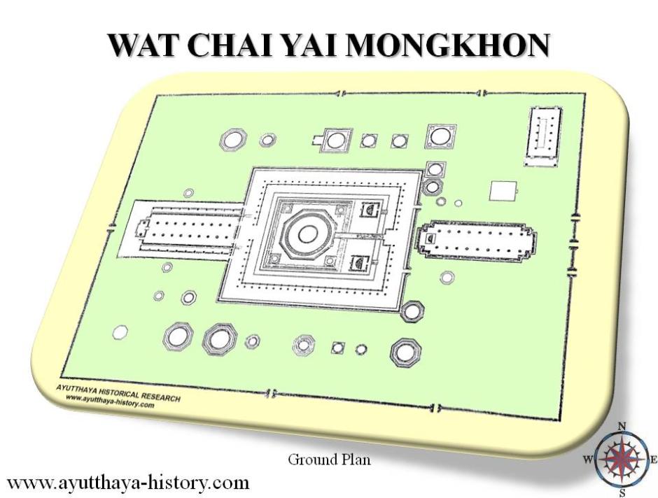 Wat Yai Chai Mongkhon or the Great Monastery of Auspicious Victory is located off the city island in the southeastern area of Ayutthaya in present Phai Ling Sub-district. In the past it bears other names as Wat Pa Kaeo, Wat Chao Phraya Thai and Wat Yai Chaiya Mongkhon. The easiest way to reach this active monastery is by turning south at the roundabout chedi on Rojana Road (Wat Sam Plum) along road No 3059. The temple can be easily found at the eastern side of the road. Wat Yai Chai Mongkhon is situated in a part of the ancient city known as Ayodhya. It is widely believed that a Dvaravati (and Lopburi allied) settlement existed here before King U-Thong established Ayutthaya in 1351. There are indications that the site was surrounded by a large moat in earlier times. The monastery was accessed before by Khlong (Pak) Khao San, which got its mouth at the new Pa Sak River. There are also traces of an ancient canal east and west of the temple; the latter ran, parallel with Khlong Khao San, also towards the Pa Sak River. There are seemingly traces from an ancient baray or water reservoir, close to the southwestern tip of the monastery. It could thus be that Wat Yai Chai Mongkhon has been built on a former important Khmer temple complex - taken also in account the large moat which represented for the Khmer, the oceans that surround the world. (1) Historical background In the year 1357 two princes of Ayutthaya, Chao Kaeo and Chao Thai, died of cholera. King Ramathibodhi I (r. 1350 - 1369) ordered the bodies of both princes to be exhumed and at the cremation site, a monastery with a holy monument (stupa) and a preaching hall (viharn), be established. He gave the monastery the name "Wat Pa Kaeo" or the Monastery of the Crystal Forest. (2) [1] The temple became the home of Buddhist monks ordained and trained at the Monastery of Phra Wanaratanathen in Ceylon (present Sri Lanka). The Sangha group was mainly engaged in meditation. The king conferred the title of "Right side Supreme Patriarch" to the head of the group, Somdet Phra Wanarat. The monastery became known as “Wat Chao Phya Thai” - The Monastery of the Supreme Patriarch. [2] This temple was repeatedly involved in the history of Ayutthaya. It was here that the conspirators (Khun Inthorathep, Mün Ratchasaneh, Luang Si Yot, Phirenthorathep and Prince Tianracha), end 1548 gathered in the preaching hall to burn candles to consult an oracle whether or not to overthrown the throne usurper Khun Worawongsa and Queen Thao Sri Sudachan; which resulted in Prince Tienracha becoming king in on 19 January 1549, crowned with the title King Maha Chakkraphat (r.1548-1569). [1] In 1561 the Patriarch of this monastery fixed the auspicious moment for Prince Sri Sin, the youngest son of the previous King Chairacha (r. 1534-1547) and Queen Thao Sri Sudachan, to overthrown King Maha Chakkraphat. Prince Sri Sin although was captured during the rebellion and died in the palace, while the Patriarch was executed for his involvement. [3] In 1592 King Naresuan (r. 1590-1605) defeated the Burmese Army at Nong Sarai by killing the Burmese Crown Prince in single-handed combat on elephant. In the battle the King and his brother King Ekathotsarot got separated from their army officers. On return to Ayutthaya the King wanted to punish to death his officers, but the Supreme Patriarch intervened and requested the punishment to be suspended; which King Naresuan granted. The Royal Chronicles of Ayutthaya although, state nothing about the construction of the great chedi. It is assumed that, on this occasion, King Naresuan ordered the restoration and enlargement of the temple and the principal chedi. The chedi was named Phra Chedi Chaiya Mongkhon. Presumably this celebration gave rise to the temple’s new name, Wat Yai Chaiya Mongkhon - The Great Temple of Auspicious Victory. Wat Yai Chai Mongkhon turns also up in western documents. In the "Diary of the Picnic incident" Van Vliet recalls that "he sent a messenger to the Abbot of Thimpiatti to request his intercession with the King, partly because this priest is a good friend of mine, who is favorably disposed towards our nation, and in part also because the merciful intercession of the Religious is freely permitted in this Kingdom". This priest was described by Van Vliet as very powerful. He needed the head monk to help him out, as some Dutch went on drunken rampage and had created problems. [4] Jeremias Van Vliet gives us also some ecclesiastical information and wrote "within the jurisdiction of Judia are the four principal temples of the whole country; namely the king's temple, Wat Syserpudt, the Nappetat, Wat Deun (which temple is devoted to the moon and where the highest school is established), and Thimphiathey." [5] Hence the importance of the help of the head monk, high in the Sangkha hierarchy, in the paragraph above. Van Vliet also wrote that the people told him: "In the pointed tower Thimphiathey there is a costly ruby, the value of which can hardly be estimated; and in order that nobody may take the buried riches from the gods, there are many dead guards placed there." His story seems to take suddenly the path of horror, when he continues: "This is to be explained in the following manner. If any mandarin - he may rich or poor - has the intention to make an offering of a human body to temple or to the gods, he chooses one or more of the most faithful, most able, and most capable men amongst his slaves. He treats this slave like his own child and shows him much friendship. By this the slave becomes attached to his master that he cannot refuse any request. And when the day has come that the treasures will be offered, the master tells this to his slave and asks him to be the guard of the offerings. The slave has been won so strongly by the honor which he has enjoyed, that he accepts the proposition voluntarily. He is then cut into two pieces at once, thrown into a pit and the money is placed on his dead body. The spirit o