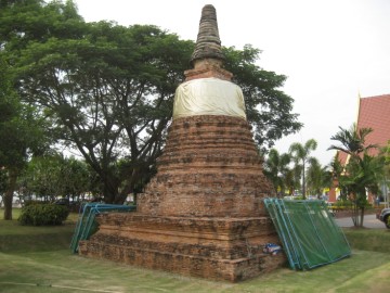 | Wat Yai Chai Mongkhon or the Great Monastery of Auspicious Victory is located off the City Island in the southeastern area at present Phai Ling Sub-district. To its east side, just over the moat, there were two small temples situated. They are called Ancient Temple No 1 and 2. Temple No 1 was located south of Temple No 2. From this temple only a restored bell-shaped chedi remains. The vihara was lost in time. The architectural style of the stupa is from the Middle Ayutthaya period but restored in the Late Ayutthaya era. It is obvious that this chedi had been redone completely by the Fine Arts Department. The chedi is classic with a square platform, a round base, a bell-shaped dome, square harmika and spire. The historical data about the monastery and its construction are unknown. The site is located in geographical coordinates: 14° 20' 42.87" N, 100° 35' 40.11" E. |