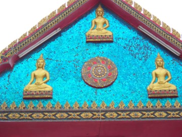 The modern temple has all the classic traits of the Ratanakosin period, including brightly colored mirrored tiles on each of its structures. Wat Yan Saen has all the usual buildings found at an active temple (sermon hall, monk’s quarters, crematorium, bell tower, etc.). Some of the modern features that stand out are a shrine to the four-headed Erawan and an interesting deviation of a Chinese-style pagoda. There is also a large, two-tiered, bell tower featuring bells at each level. Curiously, this modern site also has whimsical statues of an elephant and other animals hiding behind trees.