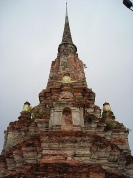 The most remarkable structure in situ at this temple, however, is its ancient chedi. Derick Garnier once praised Wat Yan Saen’s towering chedi as exhibiting, “the elegance and balance for which the architects of that time strove” (Garnier 45). It is designed in a similar late-Ayutthaya period architectural style as Chedi Sri Suriyothai. This chedi is entered from the east via a large staircase, and it is distinguished by its heavily indented corners and terraces. There are arched porticos in each of the cardinal directions. Each portico is crowned with its own niche and chedi. The niches have all been bricked over except for an entrance on the eastern side. The inner relic chamber is empty, but there is a hole in the floor leading to a crypt below (now sealed off). The spire has at least 49 rings and its harmika and finial are in good shape.