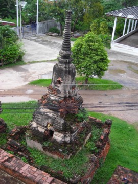 Wat Yan Saen was situated along Khlong Nam Cheawn - a canal that brought fast moving water from Khlong Muang (the old Lopburi River) to Bung Phra Ram. The water flow of this canal was regulated by a gate known as Pratu Tasibiay. A portion of the gate’s wall can still be seen along U-Thong Road near the front of this monastery. This canal was aligned with a number of temples: Wat Chum Saeng, Wat Langkha Khao, Wat Langkha Dam, Wat Sangkha Pat, and Wat Phong.