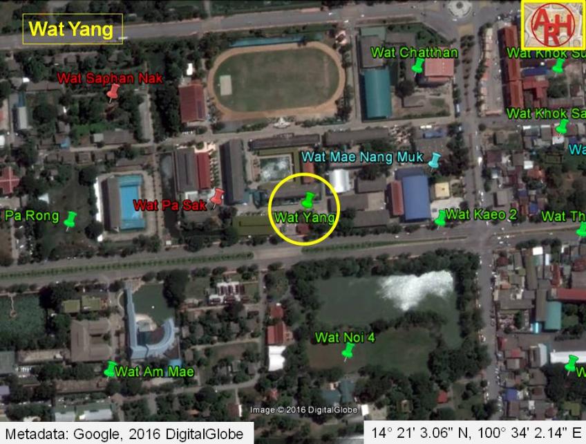 | Wat Yang or the Monastery of the Rubber Tree is a defunct temple situated on Ayutthaya's city island outside the Historical Park in Pratu Chai Sub-district. The monastery is mentioned on a map drafted in the mid-19th century. On that map, Wat Yang was situated southwest of Wat Kaeo and Wat Noi Nang Muk (aka Wat Mae Nang Muk) and northeast of Wat Pa Sak. The map indicates no presence of a chedi or prang. As Wat Pa Sak and Wat Mae Nang Muk are located on the property of Ayutthaya Wittayalai School, we could deduct that Wat Yang once must have been standing somewhere in this area. Phraya Boran Rachathanin's (PBR) map shows no (unknown) structures in the area located between the two canals being Khlong Pratu Jin and Khlong Pratu Thep Mi. We can conclude that either there were no traces anymore from this temple in PBR's period or that the drafter of the mid-19th century map wrongly indicated the position of this structure (in fact the mid-19th century map is far from being proportional). Wat Yang must have been approximately located in geographical coordinates: 14° 21' 3.06" N, 100° 34' 2.14" E. |